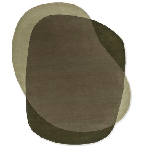 Moderní vlněný koberec Brink&Campman Element, netradičního tvaru, v kombinaci třech odstínů zelené barvy. Koberec v tlumených barvách, jež snadno splyne z prostorem, ale zároveň se může stát ústředním bodem v místnosti.