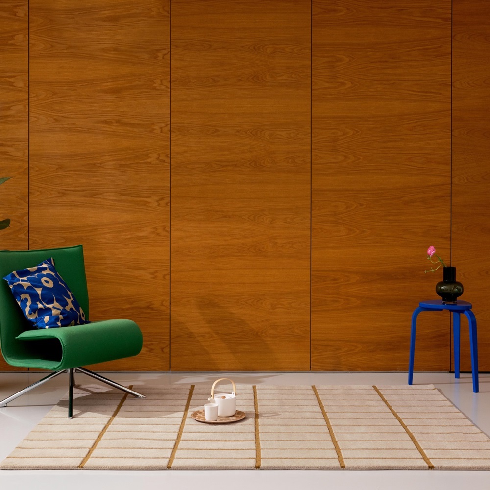 Luxusní vlněný koberec od finské značky Marimekko Tiiliskivi bronze yellow - výrobce Brink&Campman v béžové barvě, se zlatým proužkem, poskládaným do cihliček.