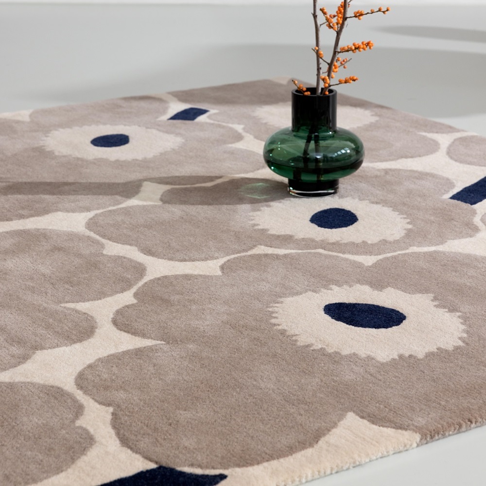 Luxusní vlněný koberec od finské značky Marimekko Unikko greige - výrobce Brink&Campman s květinovým vzorem.