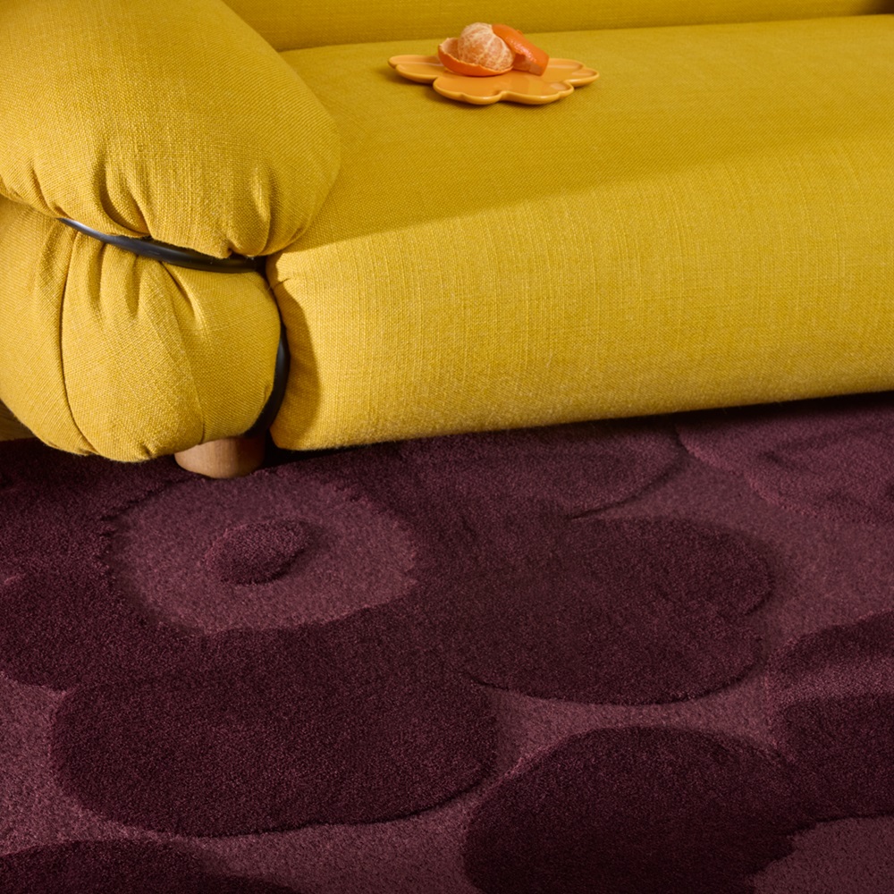 Luxusní vlněný koberec od finské značky Marimekko Unikko burgundy - výrobce Brink&Campman s plastickým květinovým vzorem.