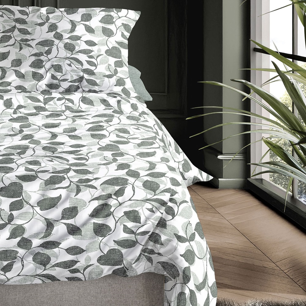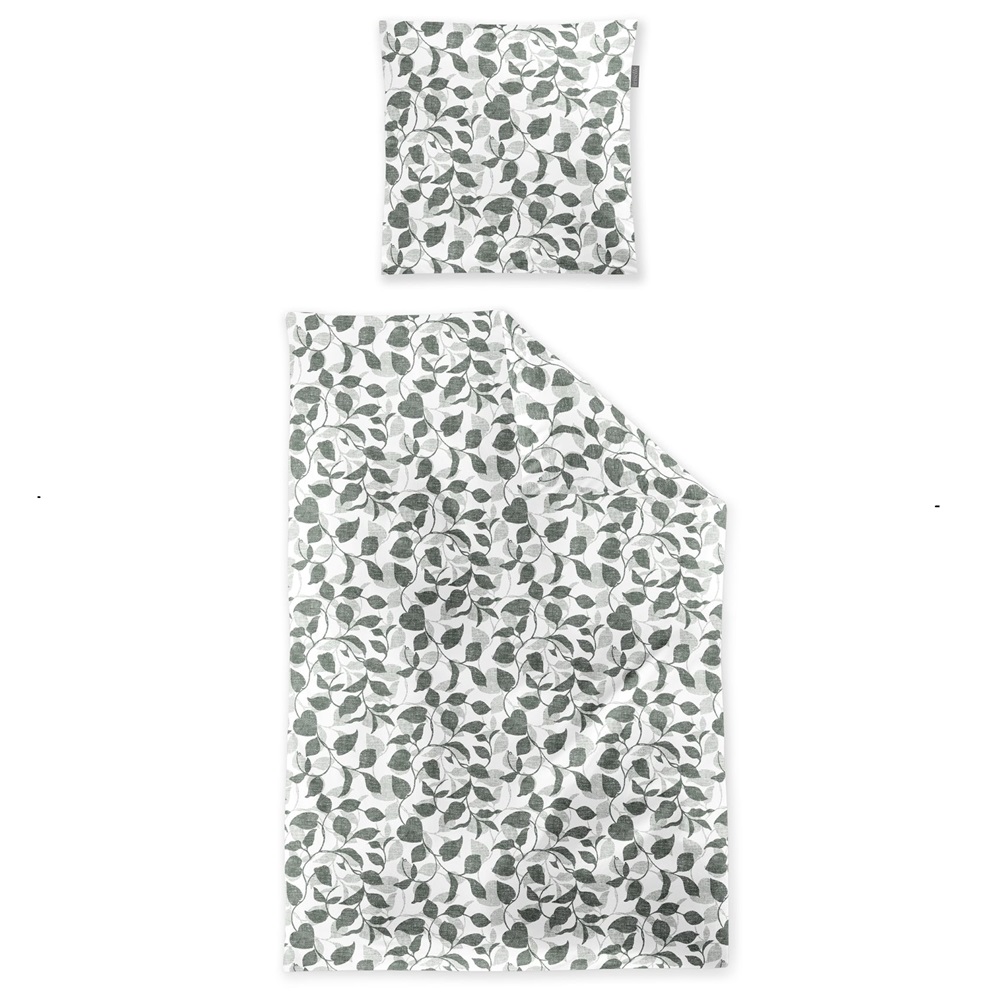 Irisette skladem novinkaBavlněné povlečení Koala s motivem lístků v kombinaci barev šalvějově zelená a šedá na bílém podkladu.