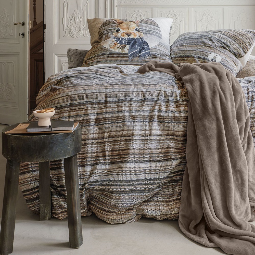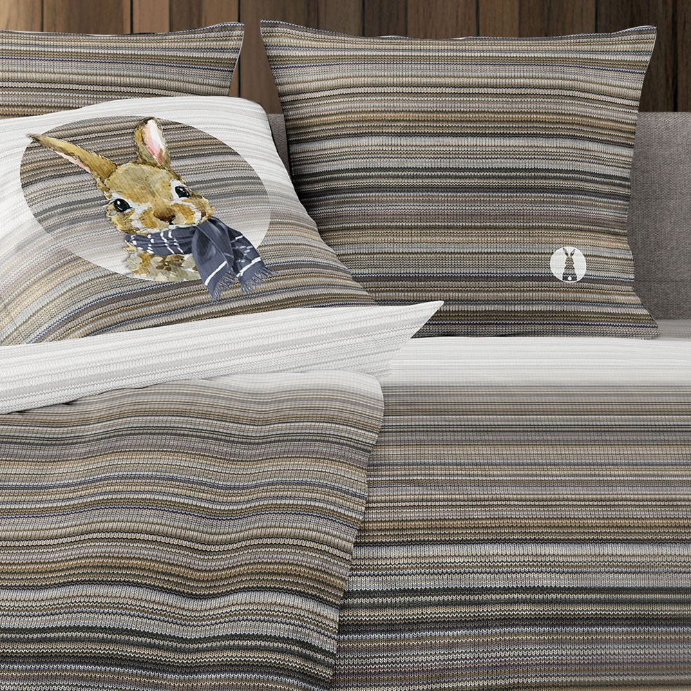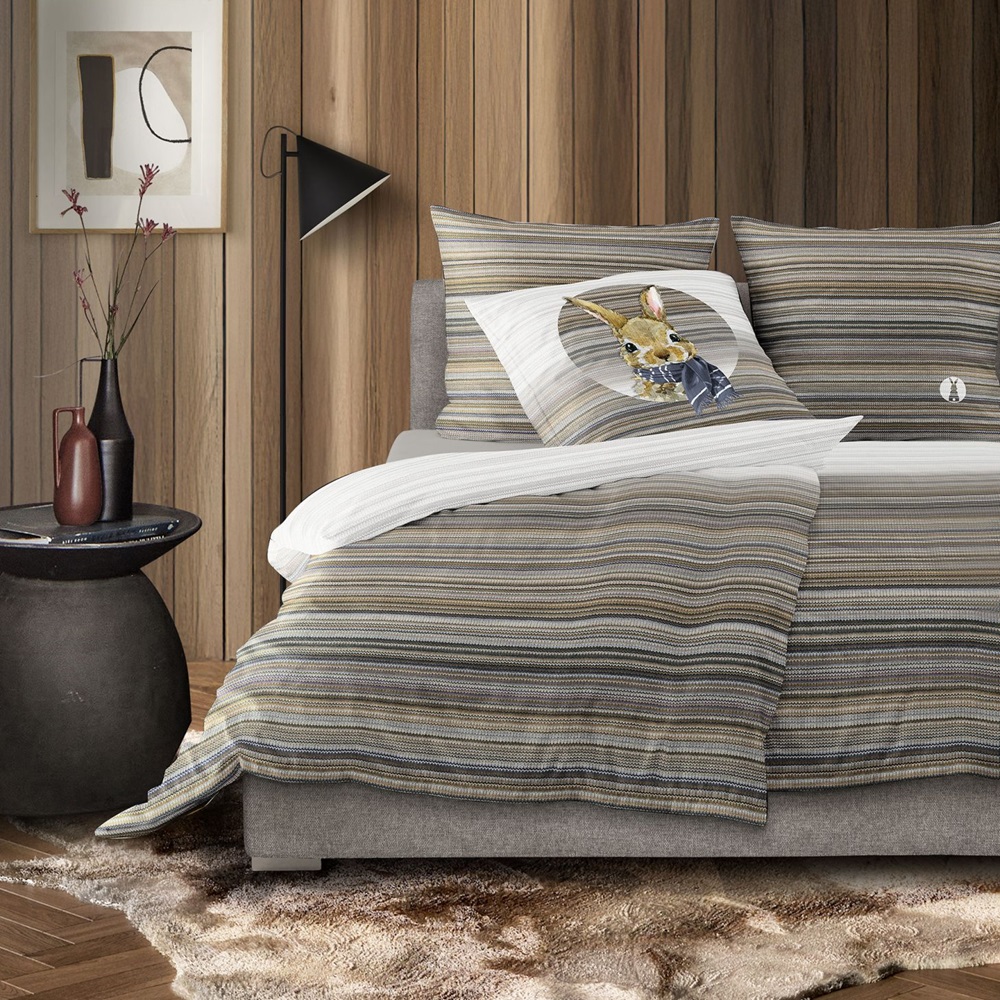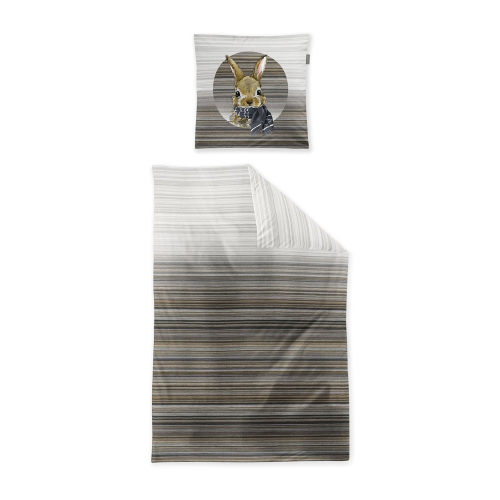 Irisette skladem novinkaBavlněné povlečení Zobel Zajíc s jemným proužkem v několika odstínech šedo hnědé barvy na straně jedné a bílo šedé na straně druhé. Na polštáři se vyjímá rošťácký zajíc s šálou.