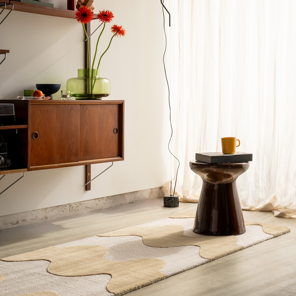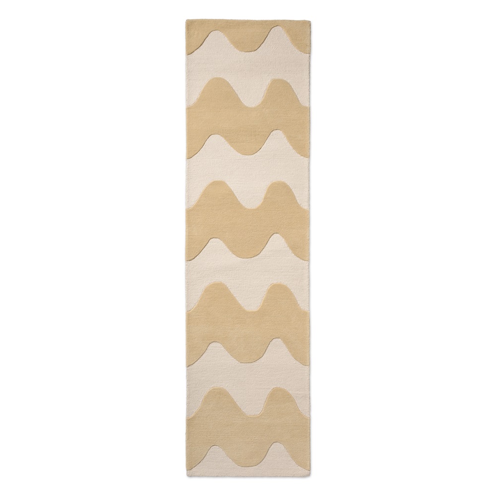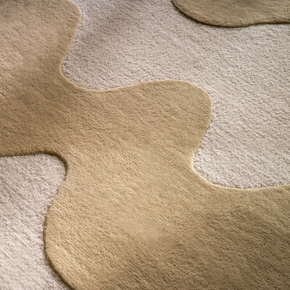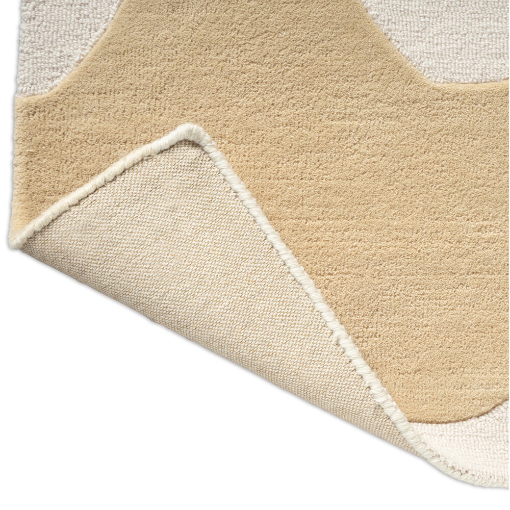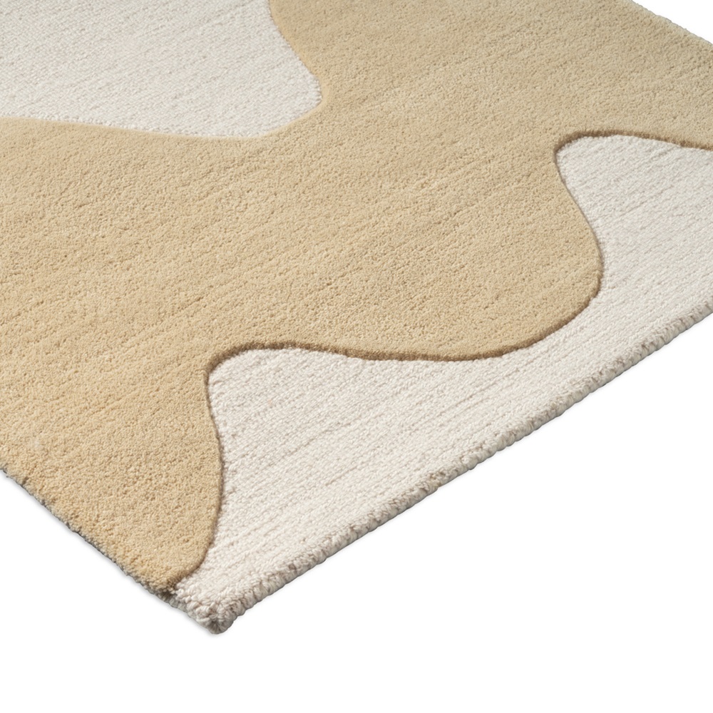 Luxusní vlněný koberec od finské značky Marimekko Lokki butter - výrobce Brink&Campman v kombinaci přírodní bílé a smetanové barvy. I zde je uplatněna metoda smyčky a střižené smyčky, jež vytváří plastické vlny.