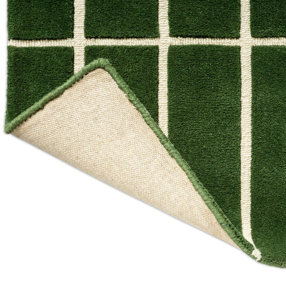 Luxusní vlněný koberec od finské značky Marimekko Tiiliskivi green - výrobce Brink&Campman v zelené barvě, s béžovými proužky, poskládané do cihliček.