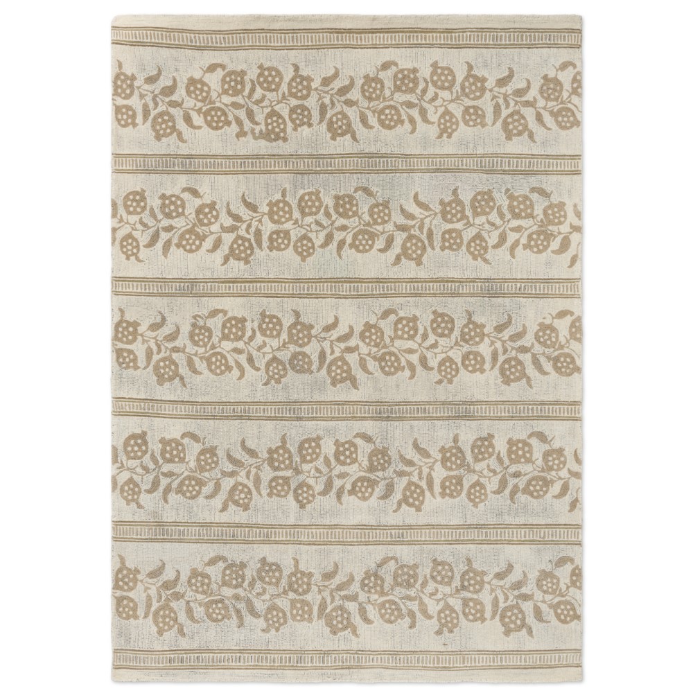 Moderní, vlněný koberec Sanderson Annar s motivem granátových jablek na větvičce, uspořádané do pruhů. Koberec je vyroben ze 100% vlny.