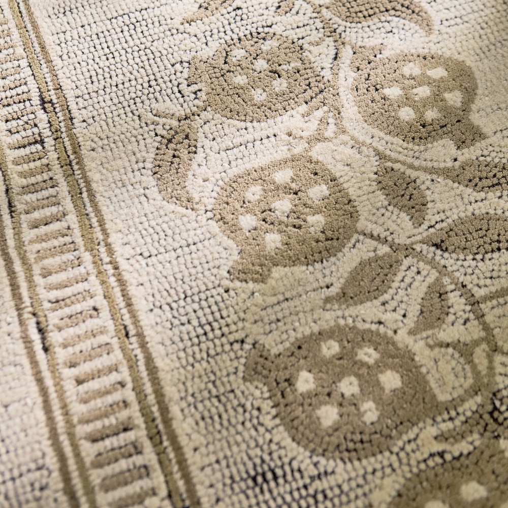 Ručně tkaný vlněný koberec s hustým vlasem.