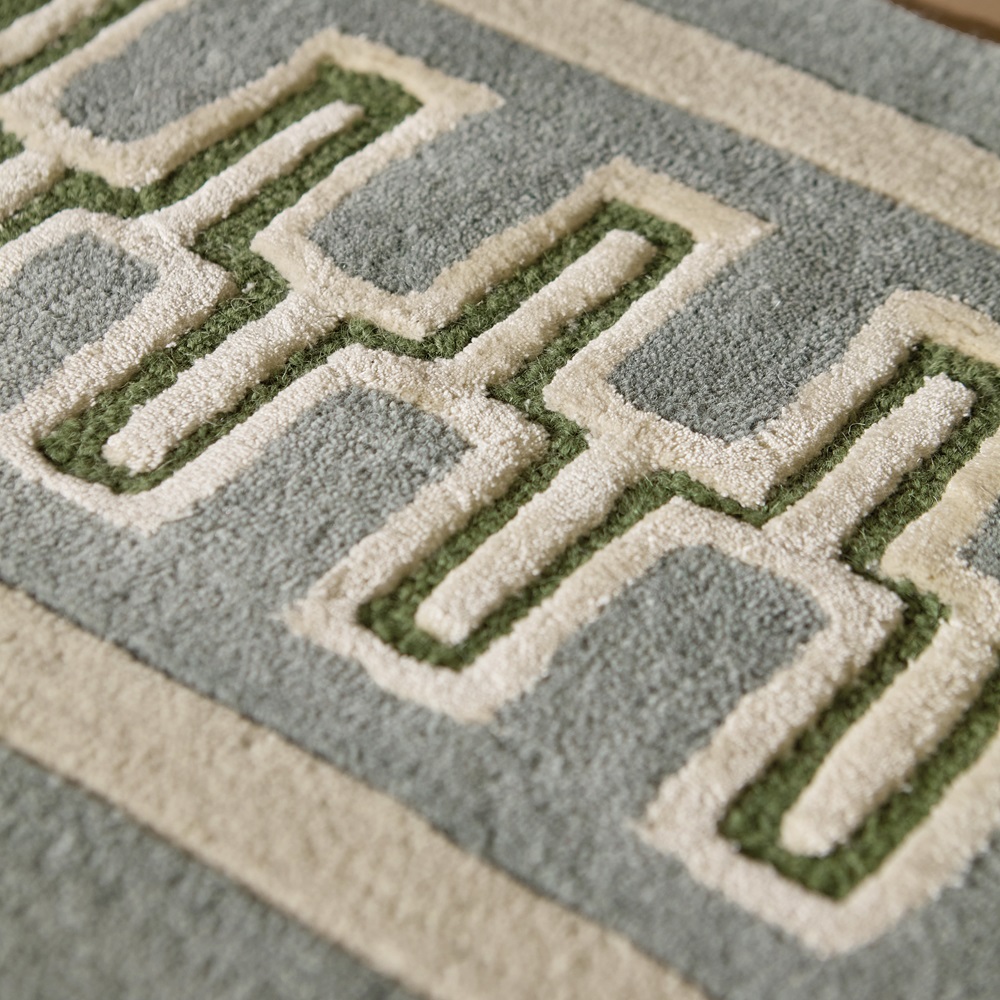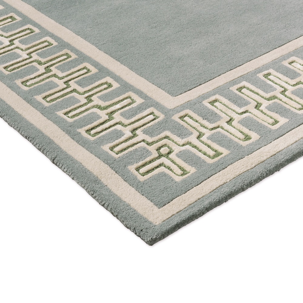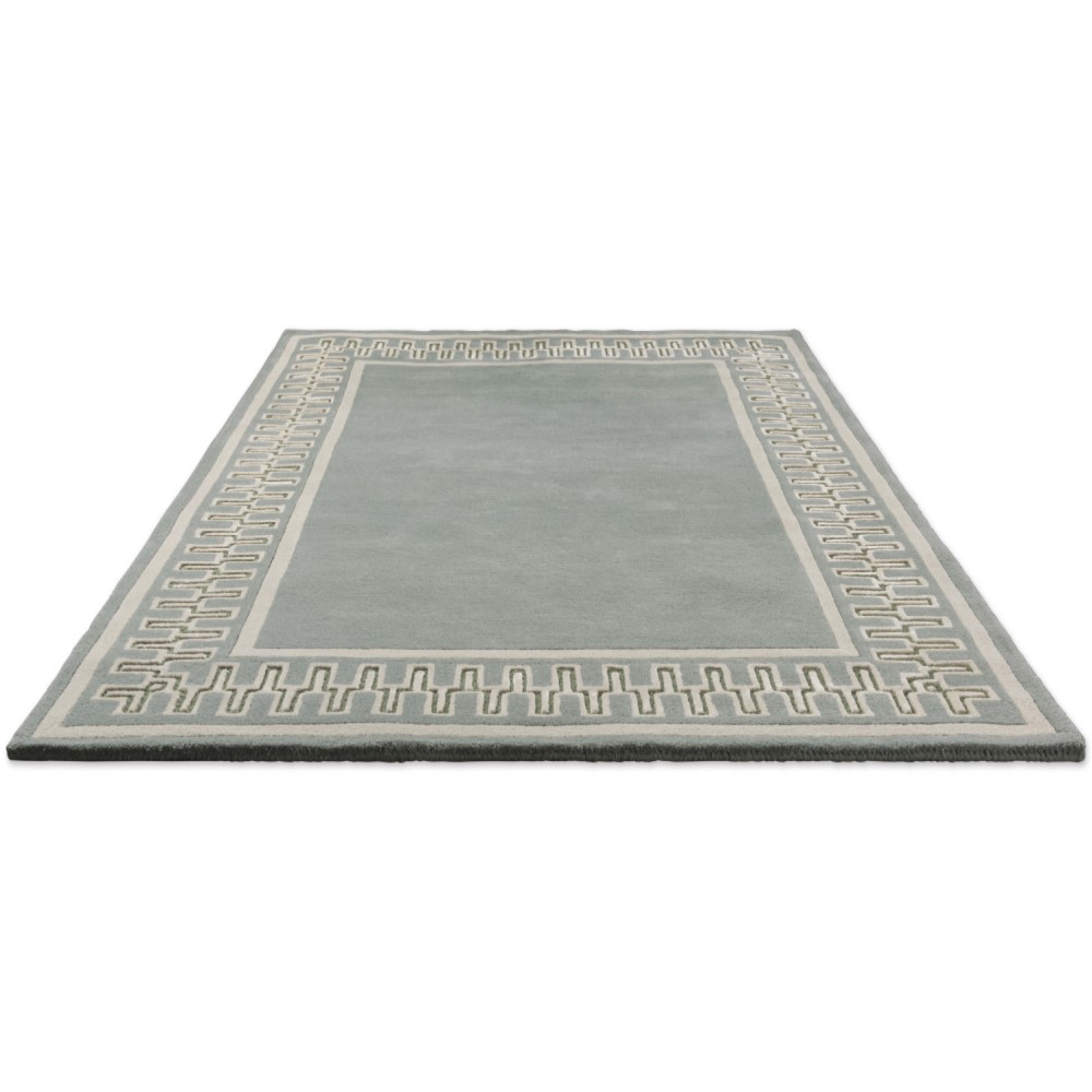 Luxusní, vlněný koberec Sanderson Linnean v šedo modré barvě s bordurou po obvodu. Koberec je vyroben ze 100% vlny s přídavkem viskózy pro jemný lesk.