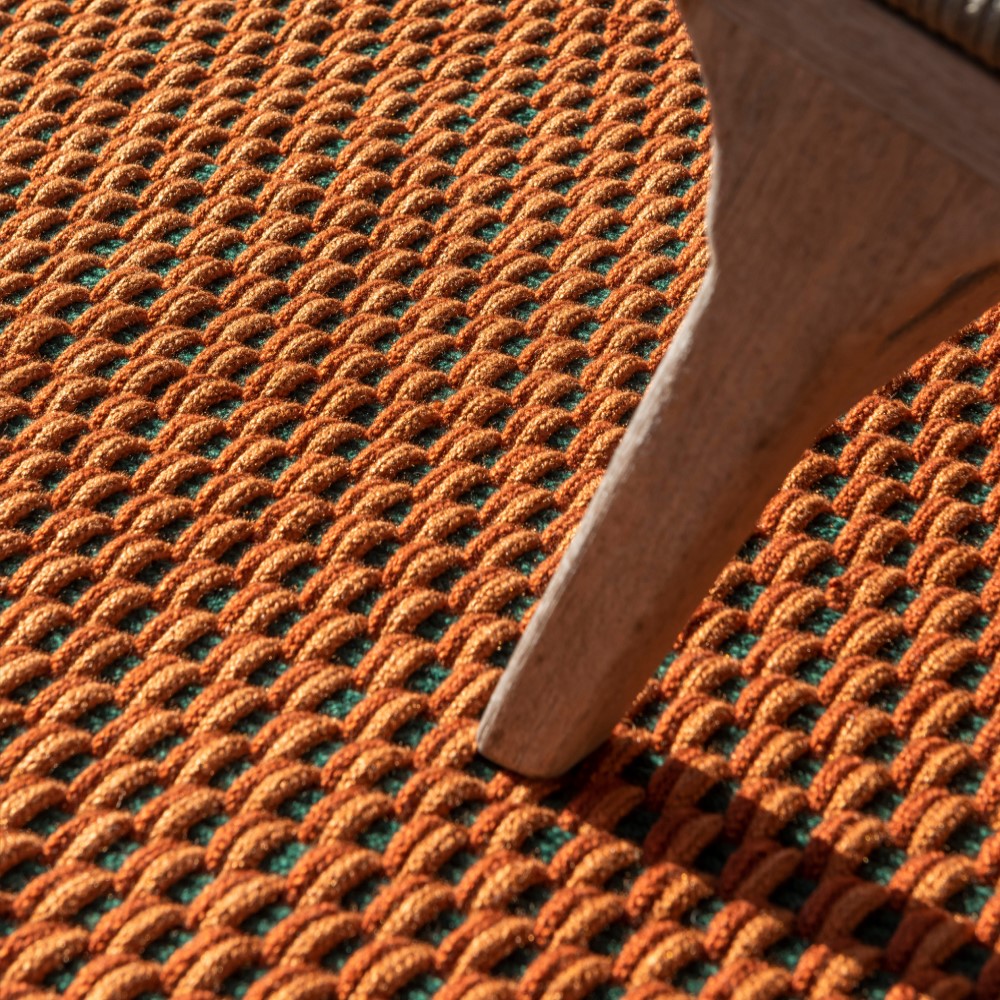 Designový venkovní koberec B&C Lace v kombinaci barev oranžová a zelená s ratanovým dezénem.