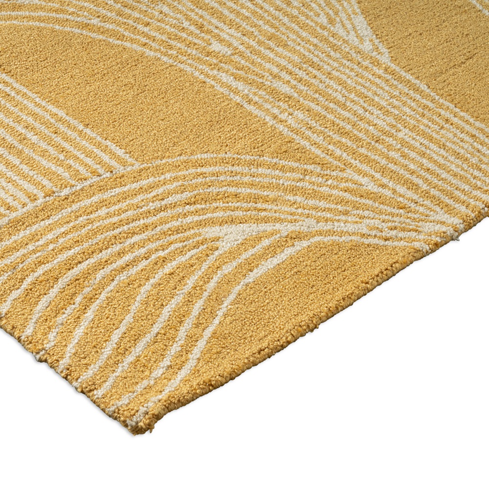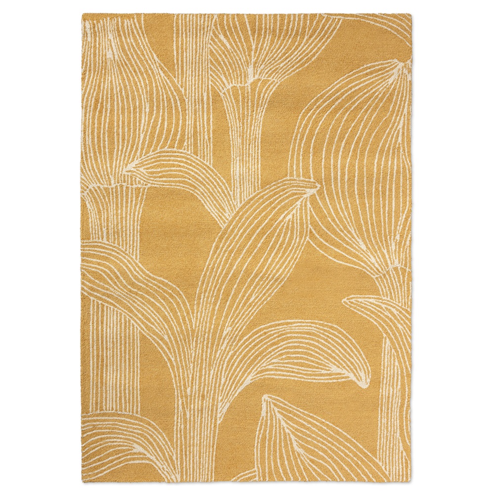 Moderní venkovní koberec Marimekko Kukat Puhkeavat straw s jemným motivem listů na slámově žlutém podkladu. Retro a moderna zároveň!